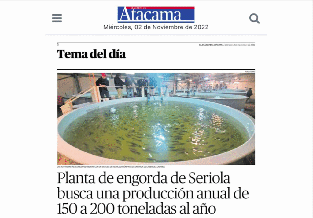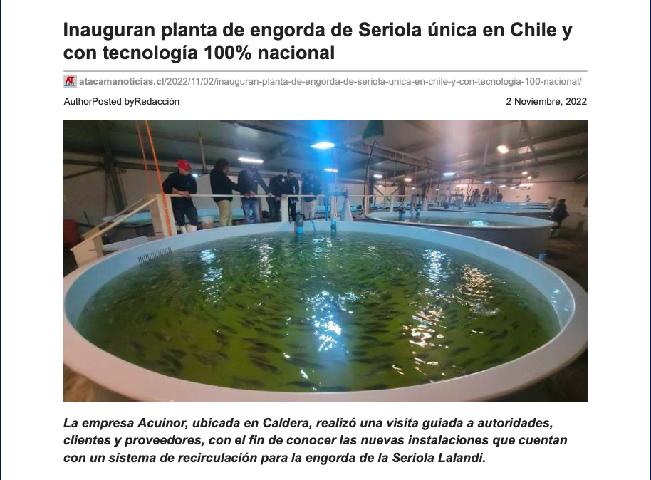 Fecha de publicación : 03/11/2022 Acuinor inauguró la primera planta RAS de ciclo completo en Chile, usando tecnologías 100% nacionales Se trata de a primera planta chile destinada a la producción y engorda de Seriola Lalandi en un sistema RAS. El proyecto cuenta con el apoyo del Programa Tecnológico Estratégico de Seriola patrocinado por CORFO, que […]